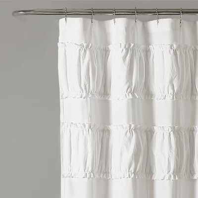 Pretty, elegant shower curtain with stripes of ruffle details covering the entire panel.