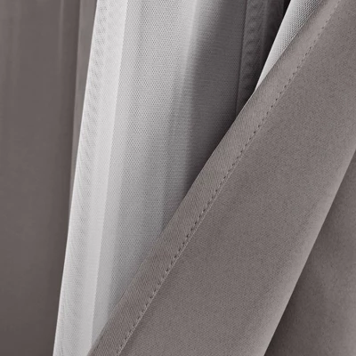 This Grommet Sheer with Insulated Blackout Lining Curtain Panel Set gives you multiple looks in one set. The blackout panels completely block the light and also help to filter outside noise. The sheer panels allow lots of natural light to enter your space while still providing some privacy from onlookers. Available in your choice of lengths, The Grommet Sheer with Insulated Blackout Lining Curtain Panel Set is the best of both worlds because you have the option of complete blackout or sheer within just this one affordable curtain panel set. The Grommet Sheer with Insulated Blackout Lining Curtain Panel Set is sold by the pair. Each panel measures 38 inches wide and is available in your choice of 63-inch, 84-inch, 95-inch, 108-inch, or 120-inch lengths. With multiple colors to choose from, you are sure to find the perfect match for your space. Metal grommets make installing these curtains a breeze. They’ll easily slide right onto your curtain rod. You will be happy to know that they are safe to machine wash and hang to dry. Please follow all instructions on the label before washing.